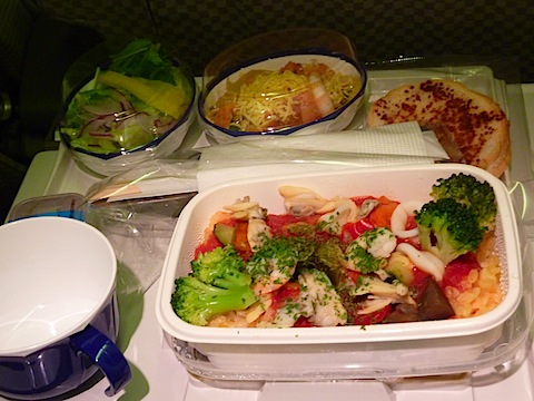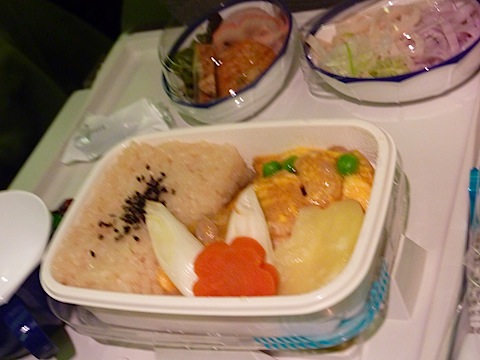 前回、ハワイ便では「たいめいけん」や「スープストックTOKYO」のタイアップ機内食であったのだが、今回はそういう趣向はなし。味はまあ、いつものイマイチいけてない奴だ。「味噌ラスク」の意外性と、デザートのハーゲンダッツが救い。