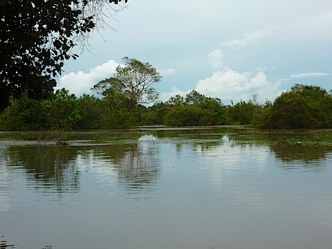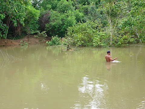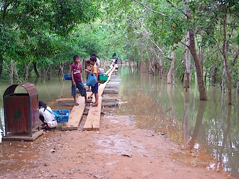 車を降りて、赤土の通路を歩き始めると、すぐこんなことになってしまった。雨期の間はこうして水浸しになってしまうのだという。乾期の間や、雨が少ない時は普通に歩けるのだそうだ。渡り板がある辺りは(普段は通路だというのだけあって)大した深さではない(落ちてもスニーカーとソックスを無駄にするだけで済むだろう)のだが、場所によっては深そうだ。なので、