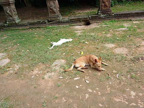 樹がからまる楼閣を東側へ抜ける。裏参道にあたるこちら側でも、リンガを模した灯籠のようなものが立ち並ぶ。観光客もすくないのか、地元の子どもたちが遊んでいたり、犬が寝ていたり、していた。